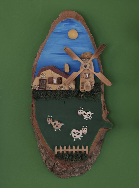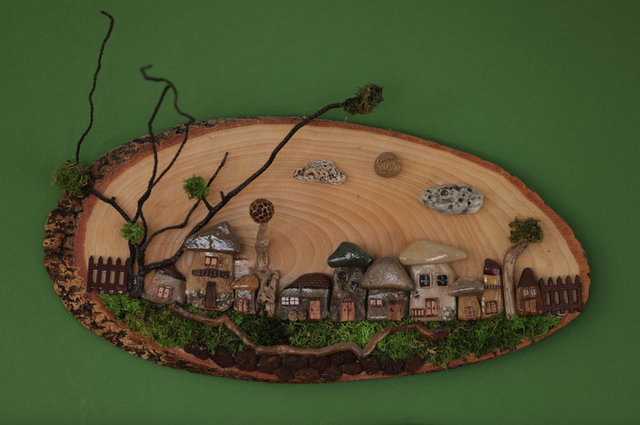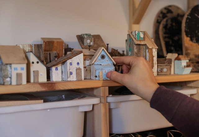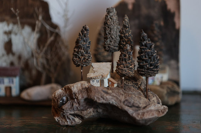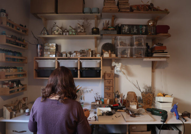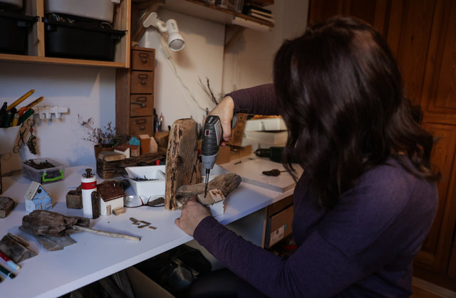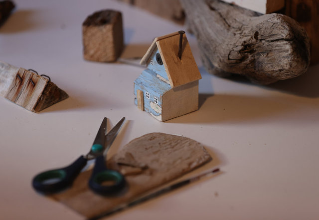Üretim sürecinde vida, çivi, testere, matkap, ip ve silikon kullandığını, doğada bulduğu paslı çivilerin de tasarımlarında özel bir yerinin bulunduğunu anlatan Dizlek, minyatür evlerin bacalarını çivilerle, ağaçları ise kozalaklarla yaptığını aktardı.