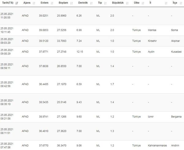 AFAD 25 MAYIS SON DEPREMLER LİSTESİ