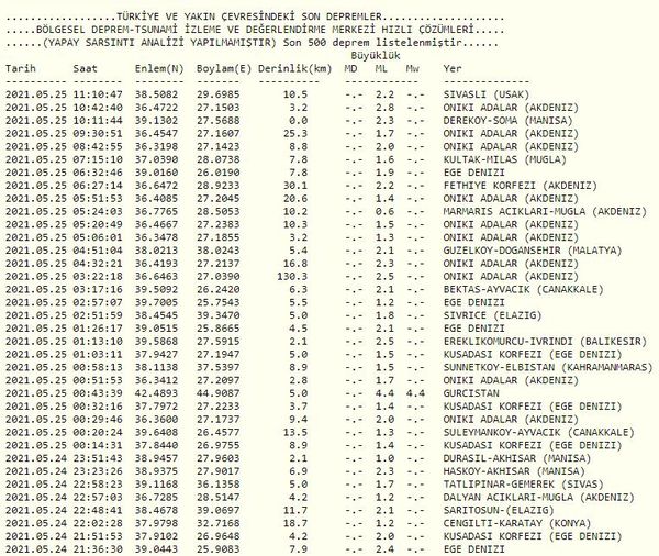 KANDİLLİ 25 MAYIS SON DEPREMLER LİSTESİ