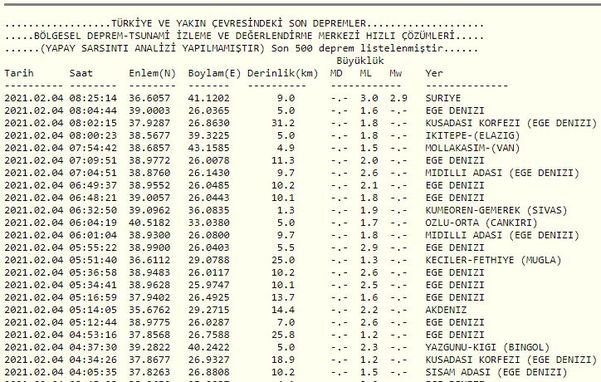 KANDİLLİ SON DEPREMLER LİSTESİ - 4 ŞUBAT