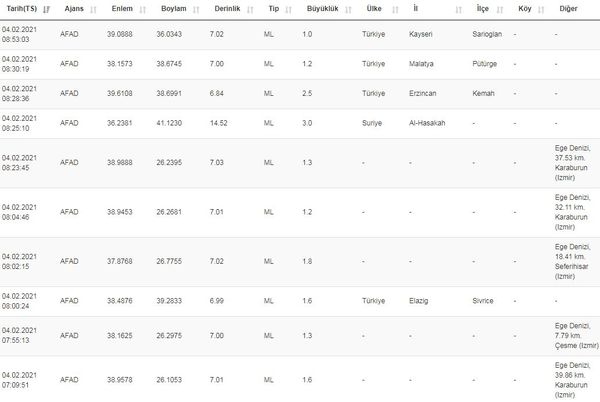 AFAD SON DEPREMLER LİSTESİ - 4 ŞUBAT