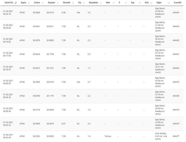 KANDİLLİ SON DEPREMLER TABLOSU: