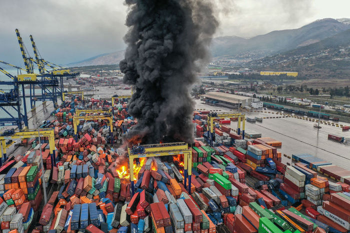 İskenderun Limanında depremin ardından devrilen konteynerlerde yangın çıktı