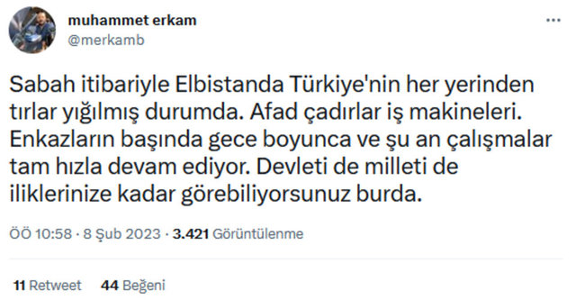 Elbistan'da yardım faaliyetlerine destek veren yönetmen Muhammed Erkam Bülbül de Twitter hesabından, "Sabah itibariyle Elbistan'da Türkiye'nin her yerinden TIR'lar yığılmış durumda. AFAD çadırları, iş makineleri... Enkaz başında gece boyunca ve şu an çalışmalar tam hızla devam ediyor. Devleti de milleti de iliklerinize kadar görebiliyorsunuz burada..." ifadelerini paylaştı.