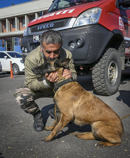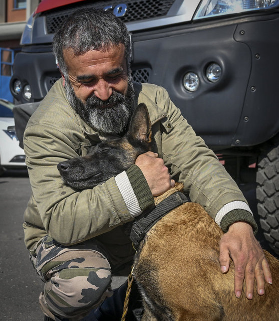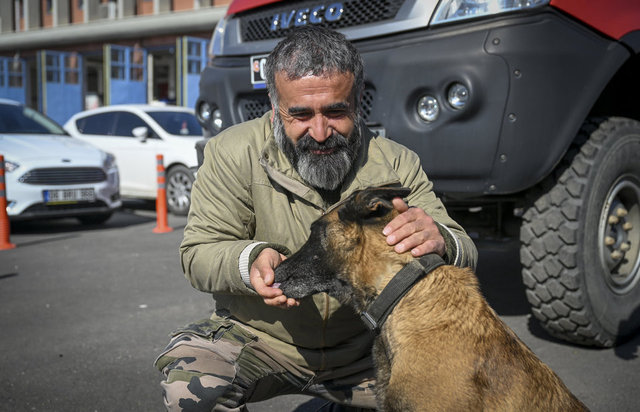 Kahramanmaraş'ta yıkılan binada apartman görevlisi olarak çalışan Mehmet Çabuk, enkaz altında yerini tespit edip kurtarılmasını sağlayan itfaiye köpeği Çakıl'la hasret giderdi
