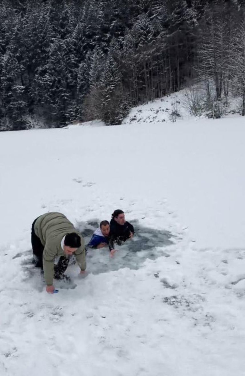 Derenin üzerinde zıplarken buz kırılınca suya düştüler; o anlar kamerada