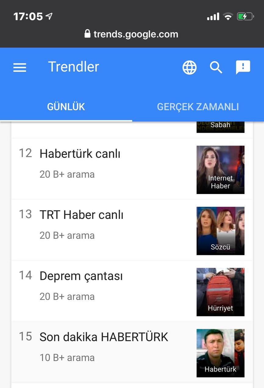 Deprem olduğu anda haberi web, mobil ve sosyal medya gibi bütün mecralarında okurlarına duyuran Habertürk, Google trendlerinde de 'Habertürk canlı' ve 'son dakika Habertürk' aramalarıyla üst sıralarda yer aldı.