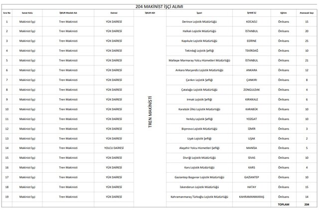 TCDD 204 MAKİNİST ALIMI YAPILACAK İLLER