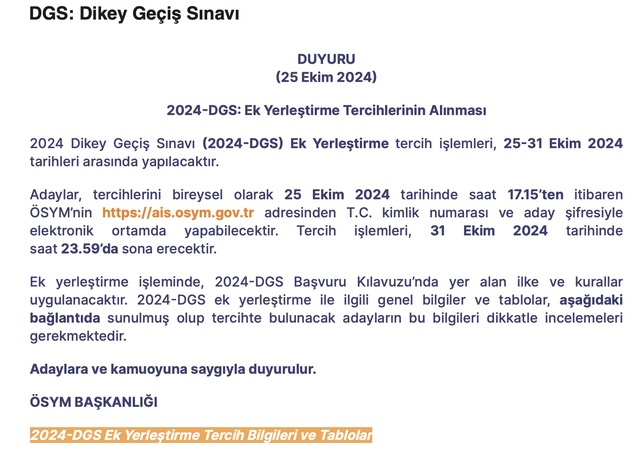 2024 Dikey Geçiş Sınavı (2024-DGS) Ek Yerleştirme tercih işlemleri, 25-31 Ekim 2024 tarihleri arasında yapılacaktır.