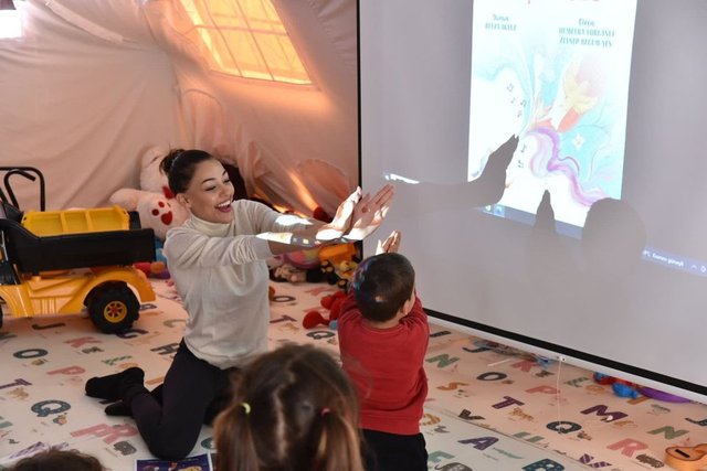 Dilan Çiçek Deniz, çocuklarla oyunlar oynayıp ardından onlara masal okudu.