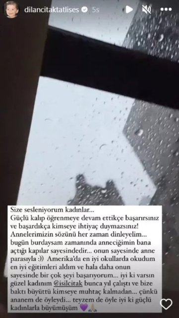 Dilan Çıtak yayınladığı hikayede şu sözleri kullandı: "Size sesleniyorum kadınlar" diyen Çıtak paylaşımında "Güçlü kalıp öğrenmeye devam ettikçe başarırsınız ve başardıkça kimseye ihtiyaç duymazsınız. Annelerimizin sözünü her zaman dinleyelim. Bugün buradaysam zamanında anneciğimin bana açtığı kapılar sayesindedir. Onun sayesinde anne parasıyla..."