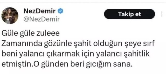 Bir dönem Dilan Polat ile ortaklığı olduğu bilinen Nez Demir, sosyal medya hesabından Şule için açtı ağzını yumdu gözünü. Ünlü fenomen paylaşımında şu ifadeleri kullandı: “Güle güle zule. Zamanında gözünle şahit olduğun şeye sırf beni yalancı çıkarmak için yalancı şahitlik etmiştin. O günden beri gıcığım sana.”