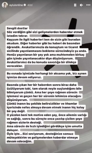 Eylül Öztürk açıklamalarında şu ifadeleri kullandı: "Sevgili dostlar, söz verdiğim gibi sizi gelişmelerden haberdar etmek istedim tekrar. Kayyum ile ilgili haberleri ben de sizin gibi buradan okudum. Diğer haberler gibi bu haberi de basından öğrendik. Avukatlarımızla da konuştum ve ticaret sicilinde yayınlanmasını bekleme sürecindeyiz şu anda. Henüz yayınlanan bir şey yok ama muhtemelen birkaç gün içinde yayınlanacaktır diye düşünüyorum. Avukatlarımız da bu konuda savcılığa bir dilekçe verecekler. Bu esnada işimizde herhangi bir aksama yok, biz aynen işimize devam ediyoruz. Basında çıkan her bir haberden sonra biraz daha üzülüyorum tabi, tam olarak neyle suçlandığımı bile bilmiyorum çünkü. Ama her şeye rağmen sürecin işlemesi ve geçen her bir sürenin lehimize olacağını düşünüyorum. Çünkü inanın bu şekilde belirsizlikler ve ithamlar içerisinde nefes almaya devam etmek inanın hiç kolay bir şey değil. O yüzden beni tek motive eden şey, önce ailemin varlığı ve sağlığı sonra bu süreçte onca yazılıp çizilen şeye rağmen sizlerin desteği. Ama sürecin de hızlı işlediğini gördükçe içim umutla doluyor. Öyle işte… Sizi seviyorum, desteğinize sonsuz müteşekkirim ve gelişmelerden haberdar etmeye devam edeceğim.”