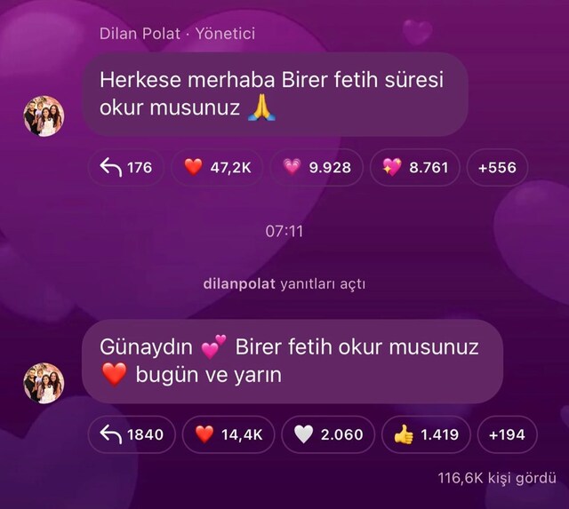 Dilan Polat, Instagram’daki "Enerciiii" isimli kanalında dün olduğu gibi bugün de 300 bin takipçisinden dua istedi.