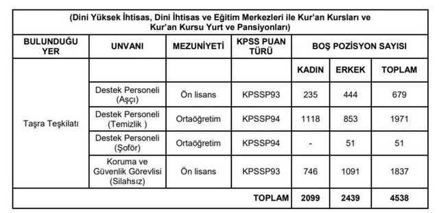 Diyanet İşleri Başkanlığı personel alımı başvuru tarihleri ve şartları gündemdeki yerini aldı. Henüz başvuruda bulunmamış kişiler tarafından başvuruların nasıl ve nereden yapılacağı merak ediliyor. Taşra teşkilatında aşçı, temizlik personeli, şoför, koruma ve güvenlik görevlisi gibi pozisyonlara totalde 4 bin 538 personel alımı hakkında merak edilenleri haberimizde bir araya getirdik. İşte konuyla ilgili güncel bilgiler...
