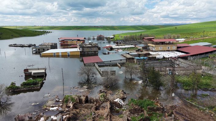 Diyarbakır'ın Kocaköy ilçesinde etkili olan yağışlar sonrası su seviyesi yükselen Ambar Barajı’nın kapaklarının açılmasıyla su, kırsal Şerifoğulları Mahallesi'ne ulaştı. Daha önce boşaltılan ve su altında kalan 10 ev, dronla görüntülendi.