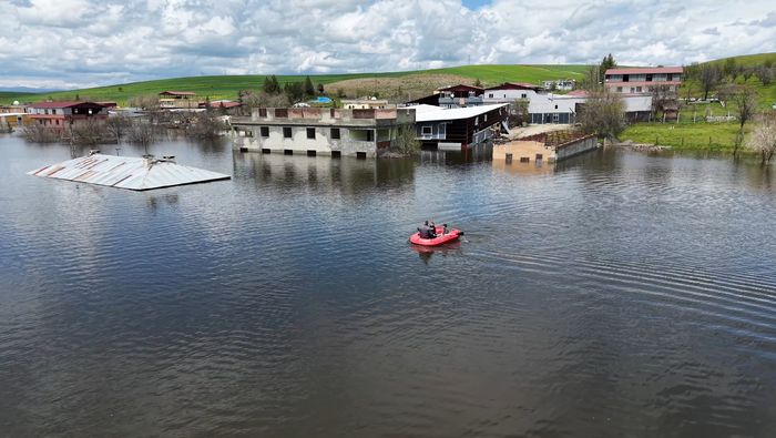 Daha önce boşaltılan 10 ev su altında kaldı. Su altındaki evler, dronla görüntülendi.