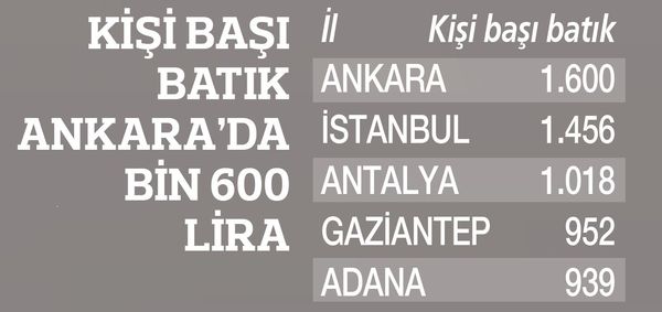 Kişi başına batık miktarında son 1 yıldaki artışta ise Anadolu illerindeki artış dikkat çekiyor. Bayburt’ta kişi başı kredi batığı yüzde 58 arttı, Muş’ta artış yüzde 51 ve Bingöl ile Mardin’de yüzde 42 civarında oldu. Çankırı’da ise batık artışı yüzde 32 olarak gerçekleşti. Ancak kişi başı en büyük artış bin 600 lira ile başkent Ankara’da bulunuyor. İstanbul’da kişi başı kredi batığı bin 456 lira, üçüncü olan Antalya’da ise bin 18 lira düzeyinde.