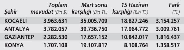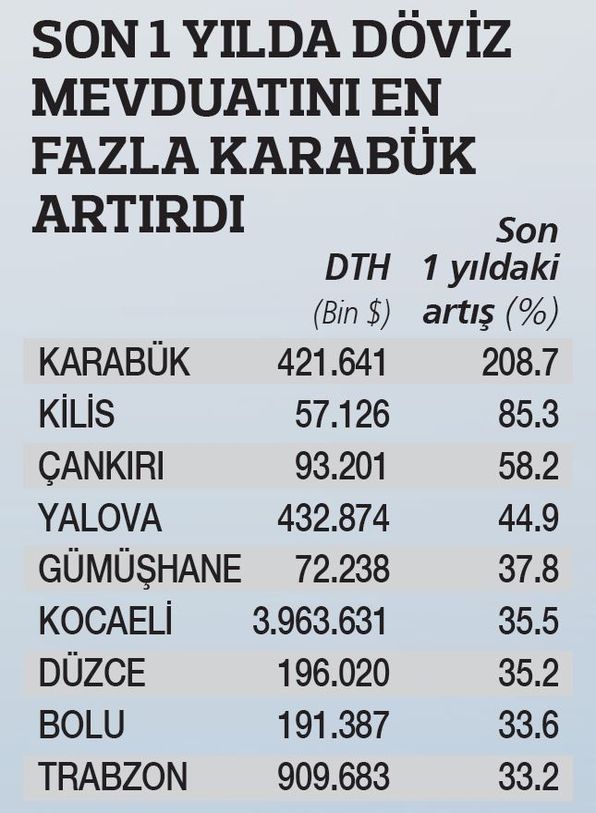 Parasının yüzde 20’sinin altındaki tutarını döviz mevduatını yapan iller ise Hakkâri, Kars, Ardahan, Siirt, Bitlis ve Urfa. Büyük illerden İzmir parasının yüzde 31’ini döviz, geri kalanını TL’de tutarken başkent Ankara DTH oranı yüzde 37 ile ortalarda yer alıyor.