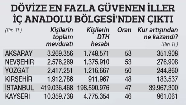 Toplam mevdata oran olarak bakıldığında ise dövizi en çok tercih eden il yüzde 51 ile Antep ve son 1 yılda yaptığı atak ile Karabük ve ardından İstanbul gibi görünse de Karabük ve İstanbul’daki döviz mevduatının büyük bölümünün şirket kaynaklı olduğu görülüyor. Antep’in dışında Aksaray, Nevşehir, Kayseri ve Kırşehir’de toplam mevduata oranla yüksek döviz mevduatı dikkat çekiyor. Sadece kişilerin döviz tevdiat hesaplarının toplam mevduata oranına bakıldığında ilk sırayı yüzde 53 ile Aksaray ve Nevşehir paylaşırken Yozgat yüzde 50 ile üçüncü durumda. Kırşehir dördüncü olurken İç Anadolu illerinin arasına İstanbul 5’inci olarak giriyor. 6’ncı ise mevduatının yüzde 46’sını dövize yatıran Kayseri oldu.