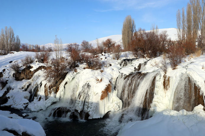 Van'ın Muradiye ilçesinde, her mevsim ayrı bir güzelliğe bürünen Muradiye Şelalesi, aşırı soğuklar nedeniyle kısmen dondu. Su, buz kütlelerinin arasından akarken, ortaya güzel görüntüler çıktı. Bölgeyi ziyaret edip, fotoğraf çeken Hamit Canpolat, herkesin doğa harikası şelaleye gelip görmesini istedi