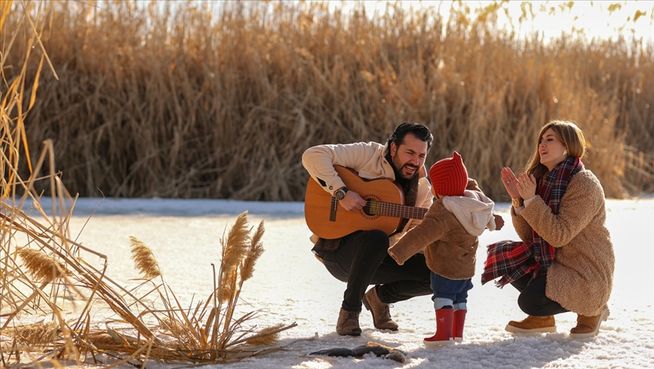 Köşk Mahallesi'ndeki sazlık alana gelen öğretmen çift, buz tabakasının üzerinde gitar ve flüt çalarak çocuklarına mini konser verdi.