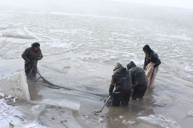 Soğuk hava ve yoğun siste buzları baltalarla kırarak ağlarla balık tutmaya çalışan avcılar, zaman zaman kırılan buzlarla kendileri de nehre düşüyor.