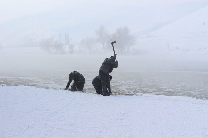 Son yılların en çetin kışının yaşandığı Ağrı'da, yazın inşaatlarda çalışan işçiler, dondurucu soğuklarda geçimlerini sağlamak için buz tutan Murat Nehri'nde balık avlıyor. Kar üzerinde uzun süre yürüyerek yüzeyi donmuş nehre gelen işçiler, burada zıplayarak hem buzları kırıyor hem de ısınıyor