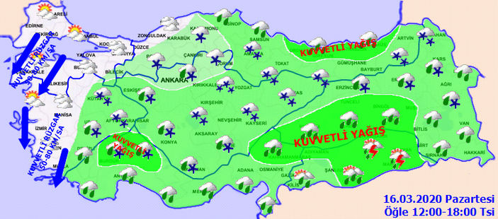 KUVVETLİ YAĞIŞ UYARISI: Yağışların, Doğu Karadeniz'in iç kesimleri ile Amasya, Yozgat ve Kırşehir çevrelerinde yoğun kar, Orta ve Doğu Karadeniz kıyıları, Doğu Anadolu'nun güneybatısı, Güneydoğu Anadolu'nun kuzey ve doğusu, Isparta ve Burdur çevrelerinde kuvvetli yağmur ve karla karışık yağmur, Adana ve Kahramanmaraş çevreleri ile Antalya'nın kuzey ve doğu kesimlerinde kuvvetli yağmur ve sağanak şeklinde olması beklendiğinden yaşanabilecek olumsuzluklara karşı (sel, su baskını, ulaşımda aksamalar, buzlanma ve don olayı vb) dikkatli ve tedbirli olunması gerekmektedir.