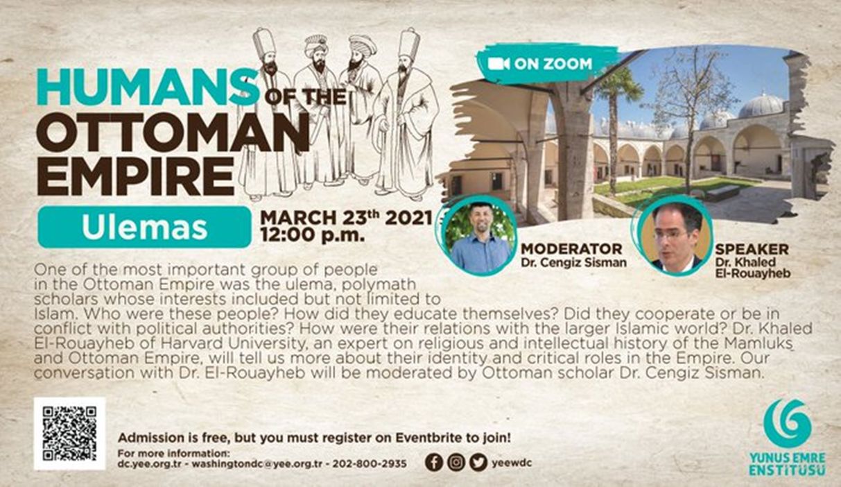 Washington DC Yunus Emre Enstitüsü tarafından gerçekleştirilen Osmanlı İmparatorluğu'nun İnsanları konuşma serisinin dördüncü programının konusu "Osmanlı İmparatorluğu'nda Ulemalar" oldu. Program Dr. Cengiz Şişman moderatörlüğünde Harvard Üniversitesinde görev yapmakta olan uzman tarihçi Dr. Khalid El-Rouayheb'in katılımı ile gerçekleşti.