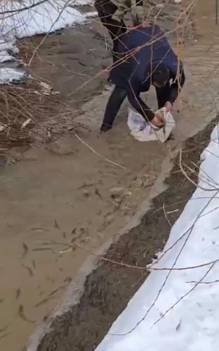 Yüzlerce balığın öldüğü bölgede köylüler, can çekişen balıkları çuvallara doldurarak derelere taşıdı.