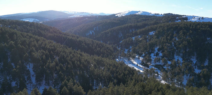 Çam ağaçlarının kar örtüsüyle bütünleşip güzel manzaraların oluştuğu tabiat parkı dronla görüntülendi.