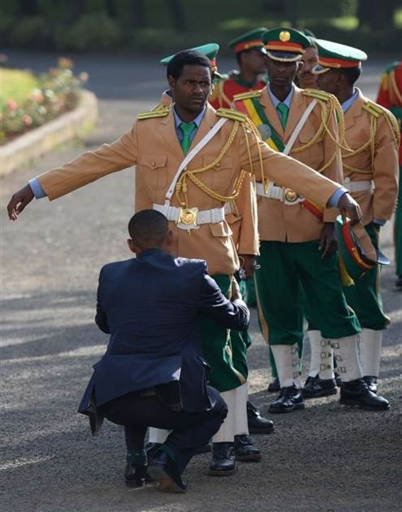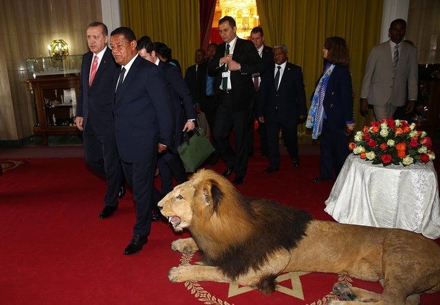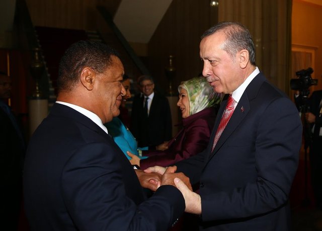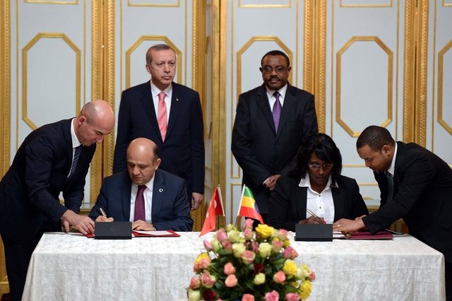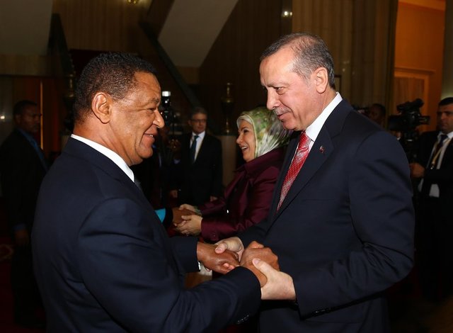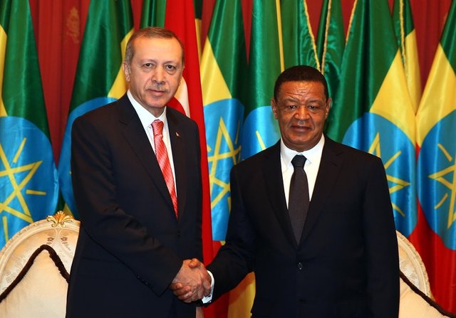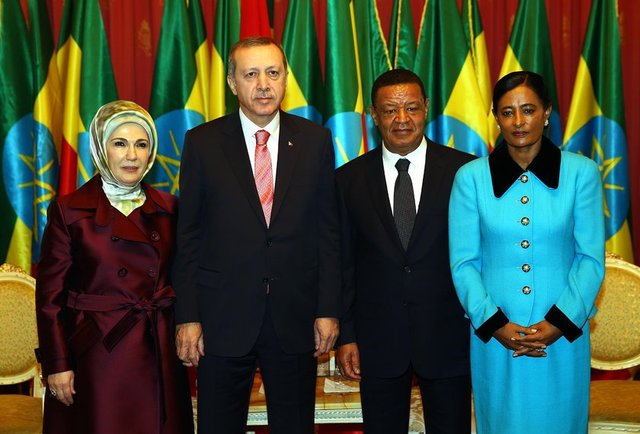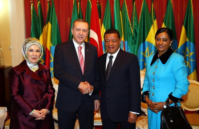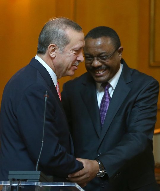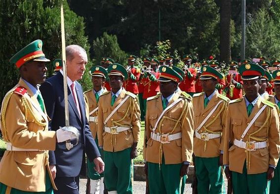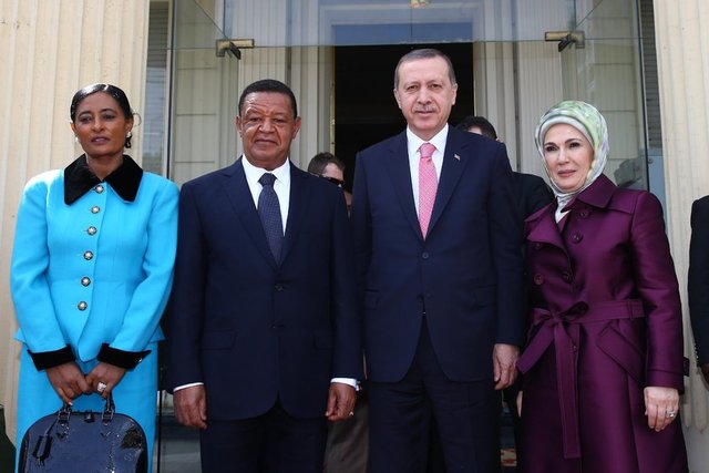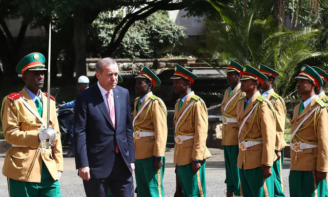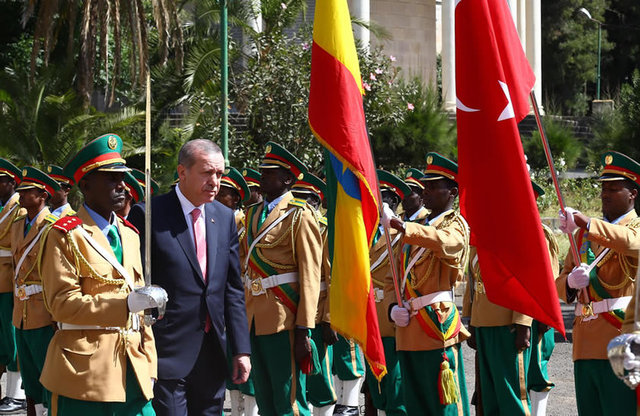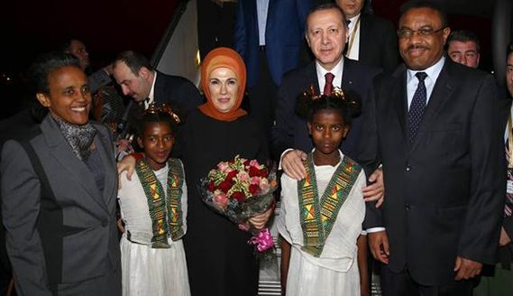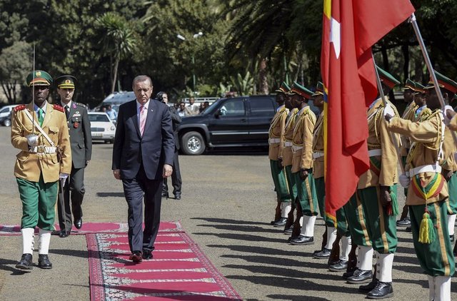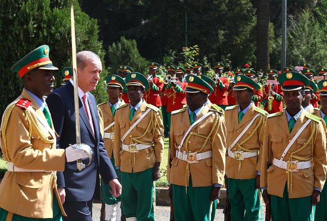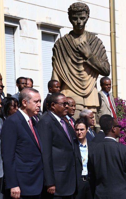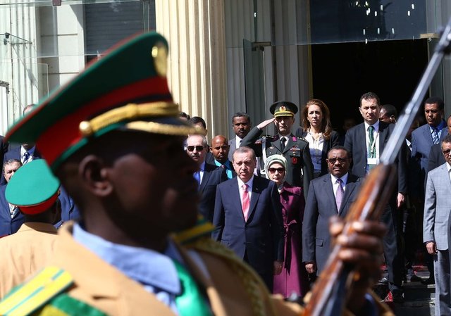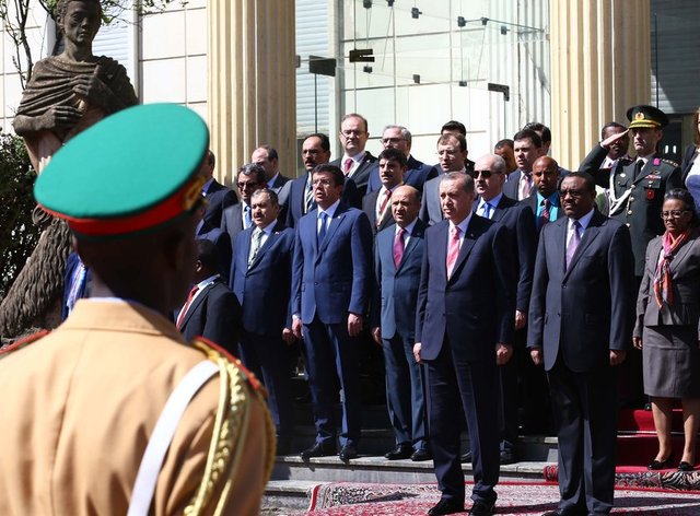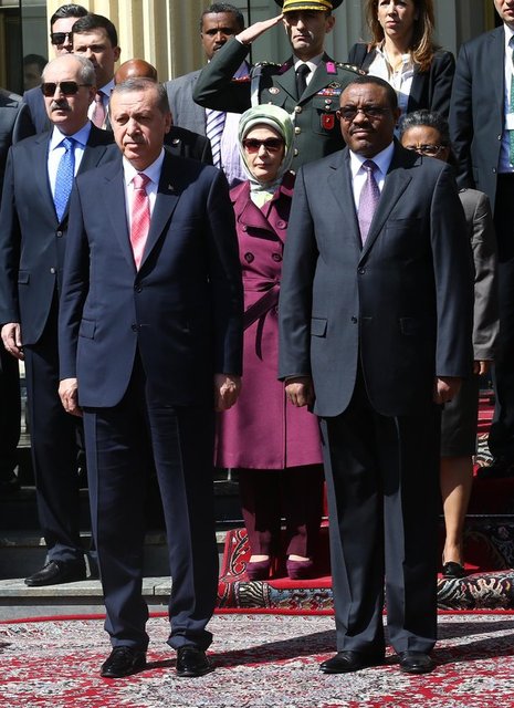 Cumhurbaşkanı Erdoğan’ı, Addis Ababa Milli Sarayı’ndaki törene gelişinde Desalegn, kapıda karşıladı. Erdoğan ve Desalegn'in tören alanındaki yerlerine geçmesinin ardından, iki ülke milli marşları çalındı. Tören kıtasını denetleyen Cumhurbaşkanı Erdoğan, daha sonra Desalegn ile baş başa görüşmeye geçti.