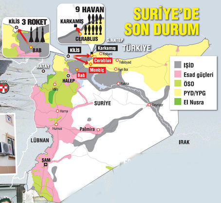 IŞİD kontrolündeki Cerablus'tan atılan 9 havan mermisi Gaziantep'in Karkamış İlçesi'ne, Bab'dan atılan 3 roket mermisi Kilis'e düştü. Türk Silahlı Kuvvetleri, IŞİD hedeflerini Fırtına obüsleriyle ateş altına aldı