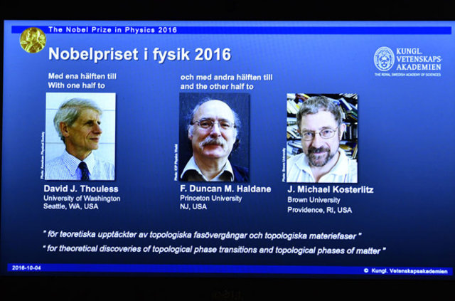 2016 Nobel Fizik Ödülü ise David J. Thouless, F. Duncan M. Haldane ve J. Michael Kosterlitz'e verildi. Nobel Komitesi, ödülün yarısının Thoulesse verildiğini, diğer yarısının ise Haldane ve Kosterlitz arasında paylaştırıldığını kaydetti.