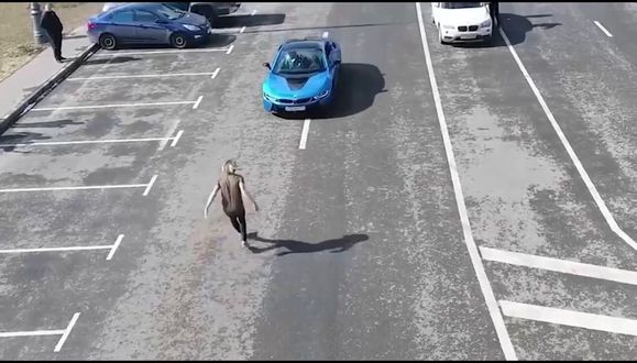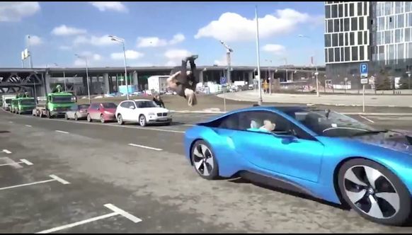 Oleg Sherstyachenko, trafiğe kapalı bir otopark yolunda, saate 96 km hızla üzerine gelen spor arabanın üzerinden atladı. Arabanın kaputuna doğru koşan adam, atlayışını havada takla atarak tamamladı. Arabadaki Amiran Sardarov'un korku dolu anları araç kamerasına yansıdı.