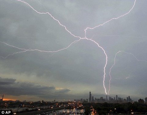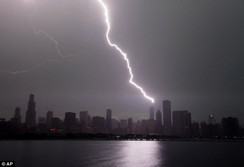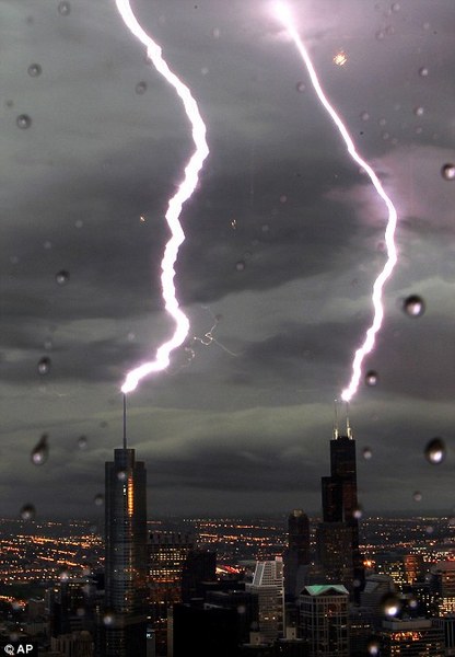 "Aynı yere iki kere yıldırım düşmez." atasözünü yalanlayan olay Hancock Tower'dan görüntülendi. Fotoğrafta Willis Tower'a (sağdaki bina) ve Chicago şehir merkezindeki Trump Tower'a düşen yıldırımlar gözüküyor.