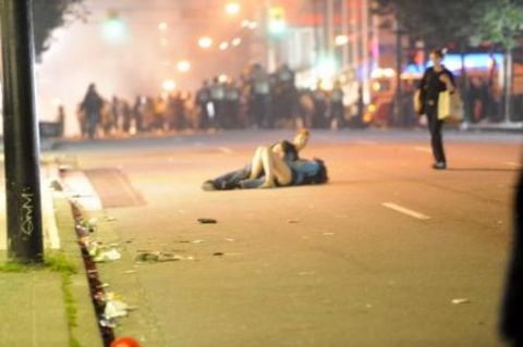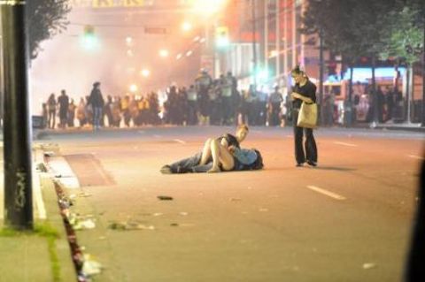 Kanada'nın Vancouver kentinde çekilen bu fotoğraf, dünyanın her tarafında tweet'lendi. Karede önlü arkalı polisler eylemcilerle çatışırken, sokağın ortasında bir kadın ve erkek yerde uzanmış öpüşüyorlar.