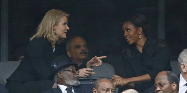 Basın toplantısında Başbakan Helle Thörning Schmidt’e Nelson Mandela’nın anma töreninde ABD Başkanı Barack Obama ve İngiltere Başbakanı David Cameron ile çekildiği fotoğraf sorulmuştu. Bunun üzerine Başbakan, “Başkan Obama ile ailemizi, Noel’i, biraz da siyaseti konuştuk. Biraz Stockholm’de konuştuklarımızın devamını, biraz da törenden konuştuk ve eğlendik” demişti. Ancak, Michelle Obama’yı kızdırdığı iddiaları hakkında yorum yapmadı.
