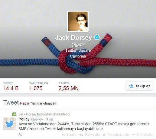 Dorsey, Twitter'ın küresel hesaplarından biri olan Policy tarafından yazılan "Avea ve Vodafone'dan 2444'e, Turkcell'den 2555'e START mesajı göndererek SMS üzerinden Twitter kullanmaya başlayabilirsiniz." mesajını retweet ederek paylaştı.