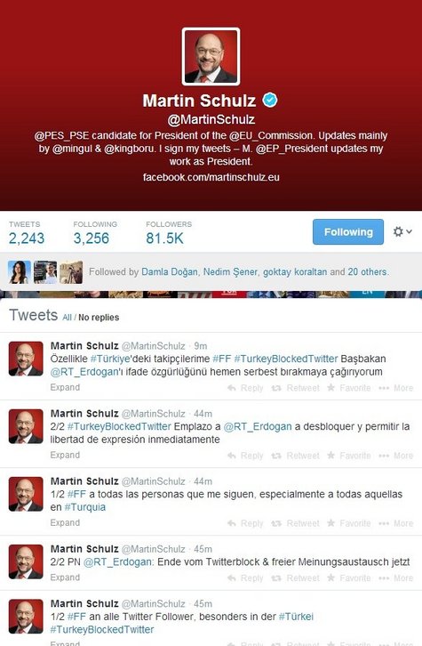 Bugünün Twitter'ın 8. yaş günü olduğuna dikkat çeken Schulz, "Ancak Türkiye'de Başbakan Erdoğan Twitter'ın kökünü kazıma sözü verdiği için bu yaş gününü kutlamak için bir sebep bulamıyoruz." dedi. Erdoğan'ın mahalli seçim kampanyasını 'biz' ve 'onlar', 'vatansever Türkler' ile 'yabancı provokatör ajanlar' söylemleri ile sürdürdüğüne işaret eden Schulz, "Bana göre tartışma Türkiye'nin nasıl daha da ileri götürülmesi gerektiği üzerine olmalı. İnterneti, sosyal medyayı ve hür basını boğmak, hakimleri siyasileştirmek Türkiye'yi 21. yüzyılın sorunlarına hazırlamak ve AB'ye yakınlaştırmak için kesinlikle iyi reçeteler değil." dedi.