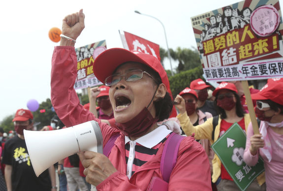 Binlerce kişinin gösterilere katıldığı Tayvan’da ‘‘maaşları arttırın’’ ve ‘‘emekli maaşlarını güvence altına alın’’ sloganları atıldı. Aralarında sendika üyelerinin bulunduğu gösterilerde Cumhurbaşkanı Ofisi önünden geçerek bir yürüyüş düzenlendi.
