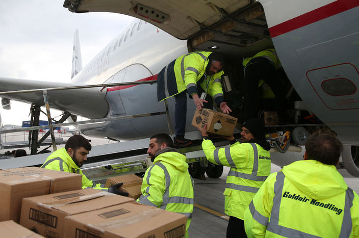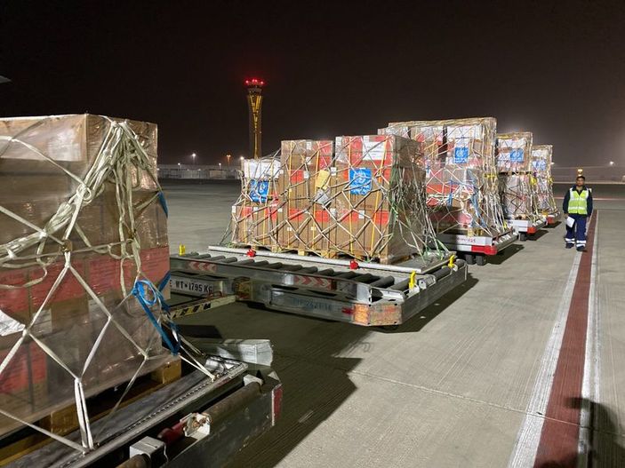 İklim Krizi ve Sivil Koruma Bakanlığından yapılan açıklamada, depremzedeler için 1500 yatak, 500 çadırın da dahil olduğu toplam 80 tonluk çeşitli insani yardım malzemesinin Aegean Havayollarına ait uçaklarla 5 seferde Türkiye'ye iletileceği bildirilmişti. (AA)