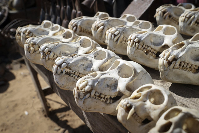 Leopardan maymuna, yarasadan yılana birçok hayvanın kafatasının ya da kurutulmuş halinin sergilendiği tezgahlarda, ölü kuşlar, fil dişleri, timsah derisi ve kobra iskeleti gibi birçok hayvan kalıntısı da alıcı bekliyor. Avcıların getirdiği hayvanlar, pazardaki tezgahtarlar tarafından satın alınıyor. Pazarda Asya'da geleneksel tıpta sıkça kullanılan ve yasa dışı ticareti yapılan pangolin uzuvları da bulunabiliyor.