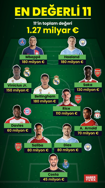 Transfermarkt, Avrupa'nın büyük liglerinde yaptığı güncelleme sonrasında dünyanın en değerli yeni 11'i de belli oldu. Kylian Mbappé ve Erling Haaland, 180 milyon euro piyasa değerleriyle ileri uçta kendilerine yer buldular... İşte 1.27 milyar Euro'luk kadro