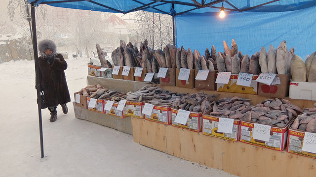 İnsanların balık ve etle beslenmek zorunda kaldığı Yakutsk'taki market ve pazarlarda en çok et ve balık bulunuyor. Burada buzdolabı kullanmaya da gerek yok tabii. Soğuk nedeniyle pazarda satılan her şey doğal olarak derin dondurucudan çıkarılmış gibi buzla kaplı.