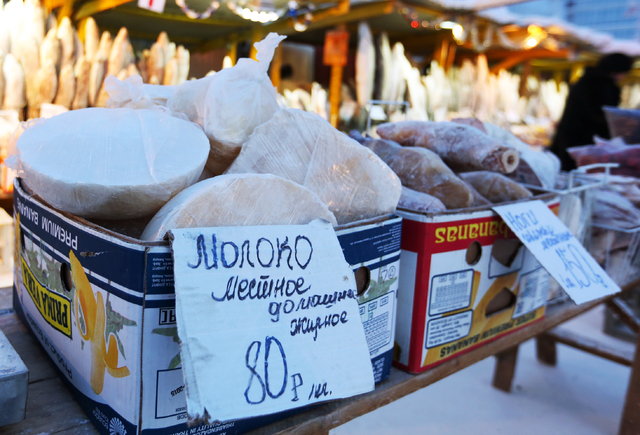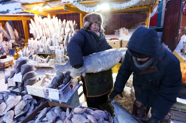 İnsanların balık ve etle beslenmek zorunda kaldığı Yakutsk'taki market ve pazarlarda en çok et ve balık bulunuyor.