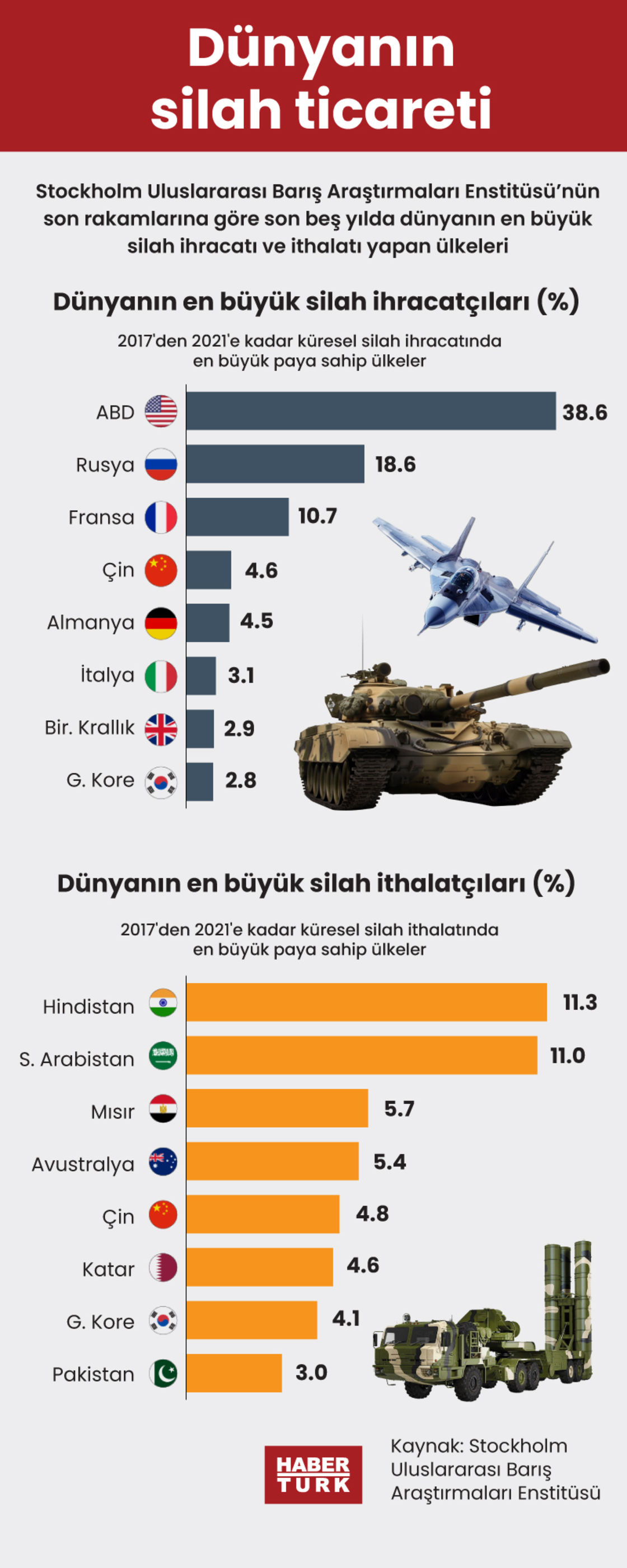 Stockholm Uluslararası Barış Araştırmaları Enstitüsü'nün son rakamlarına göre son beş yılda dünyanın en büyük silah ihracatı ve ithalatı yapan ülkeleri