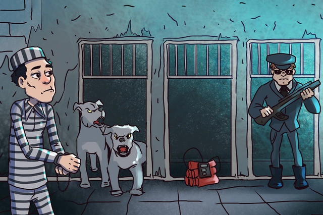 6. soru: Bir adam yakalandı ama kaçmasının 3 olası yolu var. Bir çıkışta kızgın köpekler var. İkincisinde 5 dakikalık zamanlayıcısı olan bir bomba var ve şu anda çalışıyor. Üçüncüsünün ise silahlı bir koruması var. Hangisini seçerse kaçabilir?