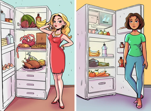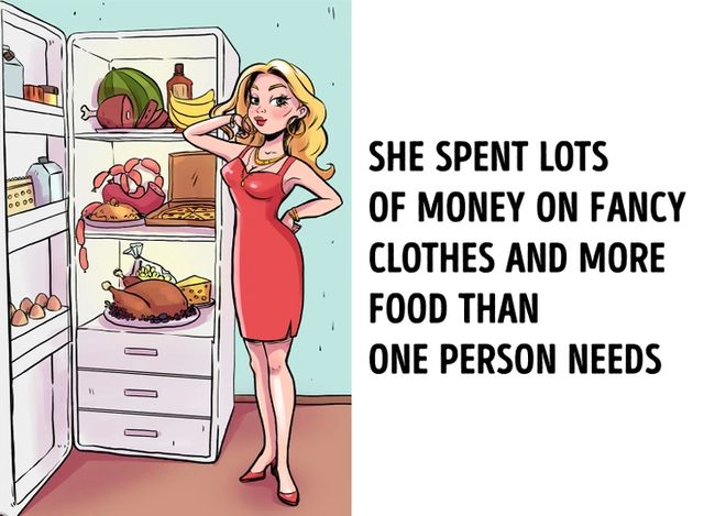 Cevap: Soldaki kadın gösterişli kıyafetlerle pahalı mücevherlere sahip, bunların yanı sıra bir kişinin yiyebileceğinden çok daha fazla yiyeceği var. Bu yüzden sağdaki ortalama bir hayat yaşadığı gözüken kadına göre daha zengin durduğundan cevap soldaki kadındır.